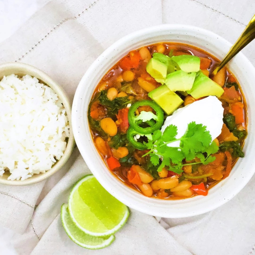Water, Cannellini beans, Jasmine rice, Red capsicum, Cherry tomato, Brown onion, Avocado, Lime juice, Jalapeno, fresh, Vegan sour cream, Olive oil (pantry item), Coriander, Vegetable stock cube, Garlic, Harissa white bean chilli spice mix (Cumin ground, Salt, Harissa spice mix, Freshly ground black pepper, Dried oregano).