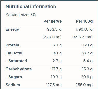 Maple syrup, Rolled oats, Almond kernels, Pumpkin seeds, Walnuts, Pistachios raw unsalted, Quinoa, Shredded coconut (Sulphites), Flaxseed, Hemp seed, Sesame seed, Vanilla extract, Sea salt, Cinnamon ground, Cloves ground, Ginger ground
