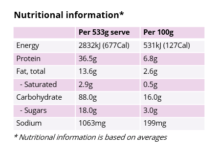 Unsweetened soy milk (pantry item), Diced tomatoes, Tomato passata, Wholemeal spaghetti, Parsley, Red wine (pantry item), Water, Brown onion, Textured vegetable protein, Carrot, Celery, Tomato paste (pantry item), Olive oil (pantry item), Vegan parmesan, Capers, Salt (pantry item), Garlic, Bolognese stock (Beef-style stock powder, Mushroom stock granules), Brown sugar (pantry item), Freshly ground black pepper (pantry item), Bolognese herb mix (Bay leaf, Dried oregano).