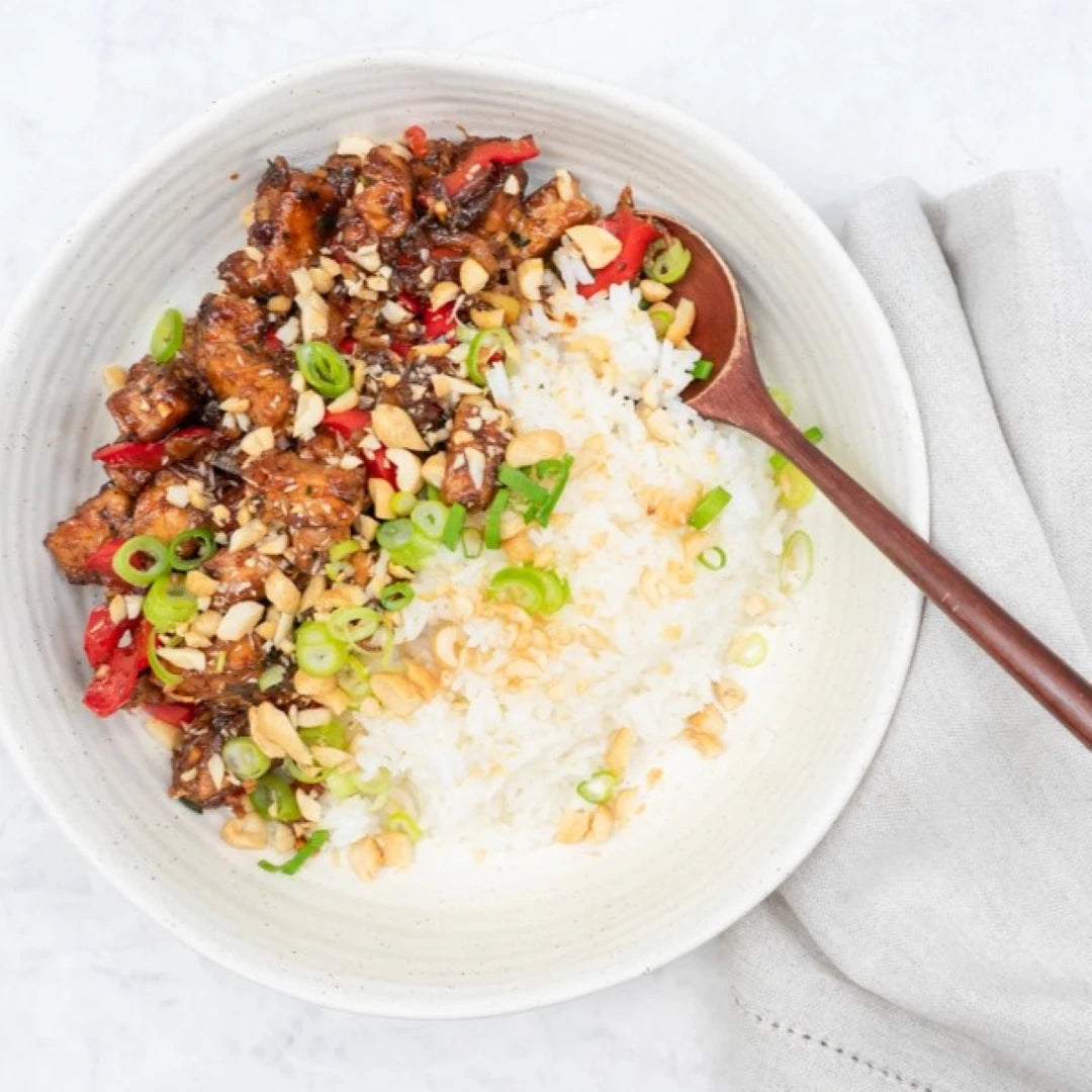 Sweet and sticky housemade kecap sauce coats crispy tempeh and peanuts on a bed of fluffy rice, you'll wonder why you ever ordered takeout!