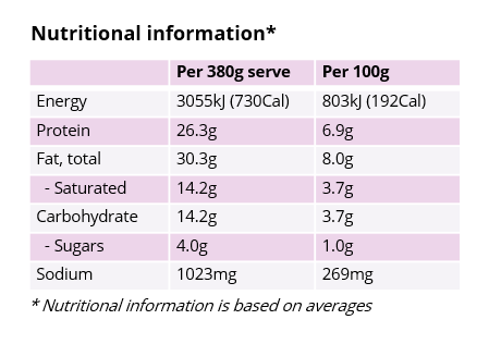 Button mushrooms, Spaghetti, Smokey rashers (Vital wheat gluten, Water, Tapioca flour, Tomato paste, Soy sauce Kikkoman, Vegetable oil, Miso red, Maple syrup, Liquid smoke, Rice vinegar, Nutritional yeast, Smoked paprika, Onion powder, Garlic powder, Smoked salt, Ground white pepper), Plant based cream (Flora), Brown onion, Vegan parmesan, Water, Olive oil (pantry item), Salt (pantry item), Garlic, Thyme, Freshly ground black pepper (pantry item), Mushroom stock granules.